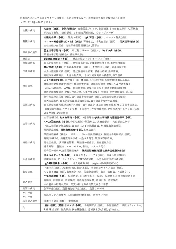 日本におけるコロナワクチンと疾患の関連報告(2021年12月~2025年11月)更新 2025年11月14日 ワクチン 印刷用 PDF 日本国内においてコロナワクチン接種後、急に発症し、医学学会で報告された疾患(2021年12月~2025年11月) 学会、疾患、報告者の詳しい情報はこちら